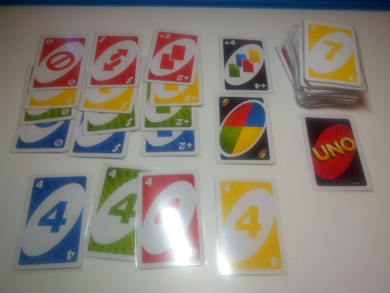 Нужно выкладывать подходящие по числовому значению или цвету, но не так все просто, есть и специальные карты: вытяни 2 карты, смени направление, пропусти ход, дикая карта (меняющая цвет), дикая карта+вытяни 4 карты.