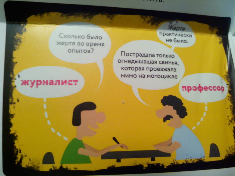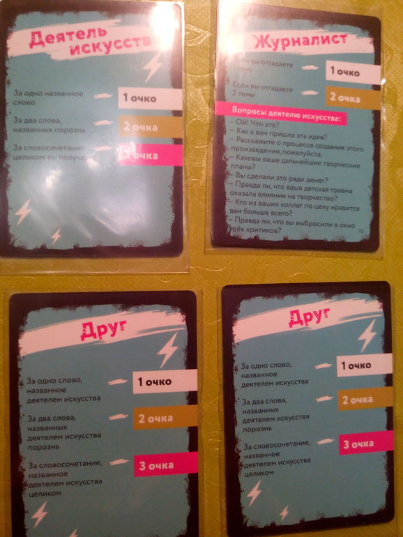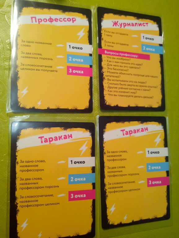 Спереди и сзади карточек написаны подсказки как заработать очки, задачи и для журналиста темы (ведь в конце игры ему нужно угадать тему этих слов), а так же примерные вопросы, которые можно задать во время интервью профессору: