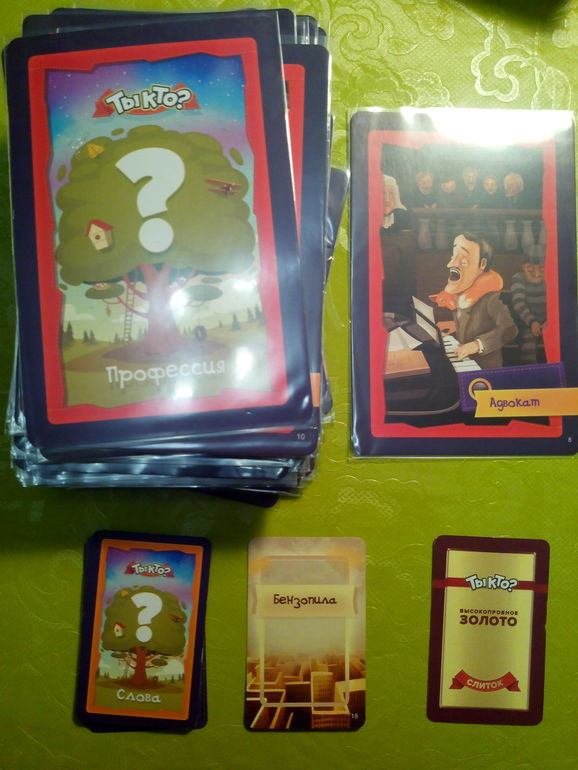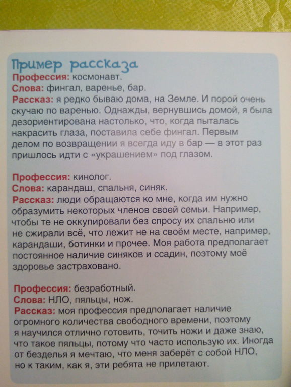 Нужно придумывать рассказы\байки про профессию, на выбранной карточке, приплетая туда слова со специальных карточек, ну и конечно же отгадывать карты других. Схема, как в диксит, т.е. нужно рассказать так, чтобы поняли, но не все.