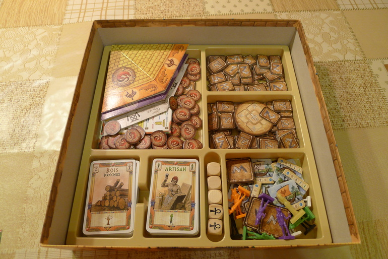 Итак, замешали колоду для рынка, положили три карты на прилавки рынка, раздали каждому по 5 талантов и 3 карты, в придачу дали 3 джокера (кораблики), 2 статуи Анубиса (при выкладывании мозаики, остаются места, куда уже не поместить другую деталь, можно поставить эту статую, в конце игры простят столько штрафных значков, сколько клеток в убежище Анубиса) и пирамидку - чтоб хранить в тайне свое количество значков коррупции.