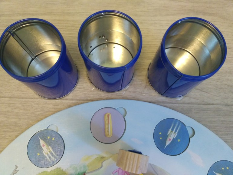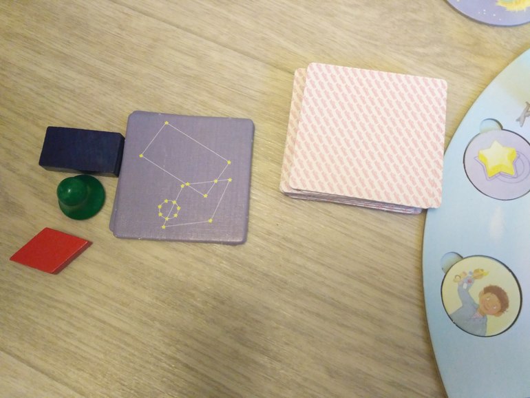 В начале игры карточки с заданиями рандомно кладут на игровое поле, картинкой вниз. В центр - деревянные фигурки и рядом тактильная цепочка, баночки, шарики марблс, круглые и квадратные карточки с проекциями деревянных фигур. Механика довольно проста, кидаем кубик - передвигаем человечка) На выпавшей карточке выполняем задание. И вот с этого момента начинается самое интересное. Задания одной и той же карточки могут самые разные, в зависимости от игрока: маленьким попроще, взрослым от сложных до очень сложных. За выполнение задания игрок получает одну планету и ставит ее на свою галактику. Заработал 5 планет = выиграл)