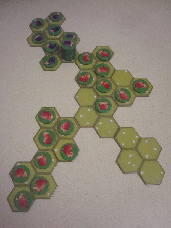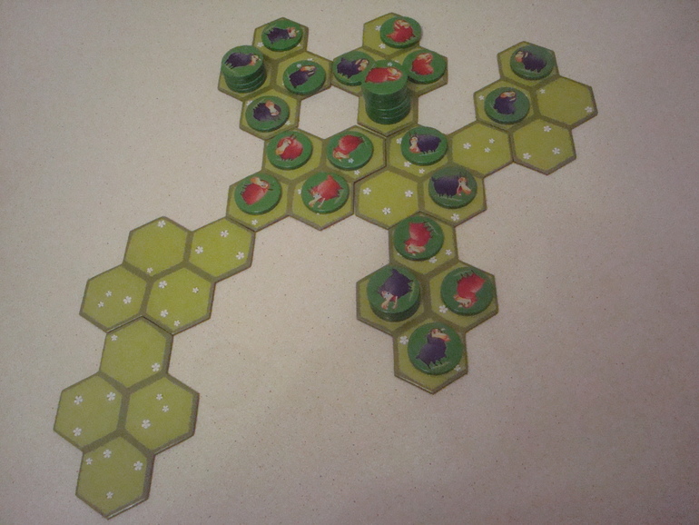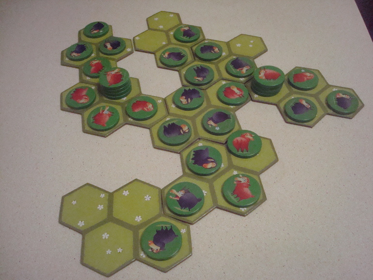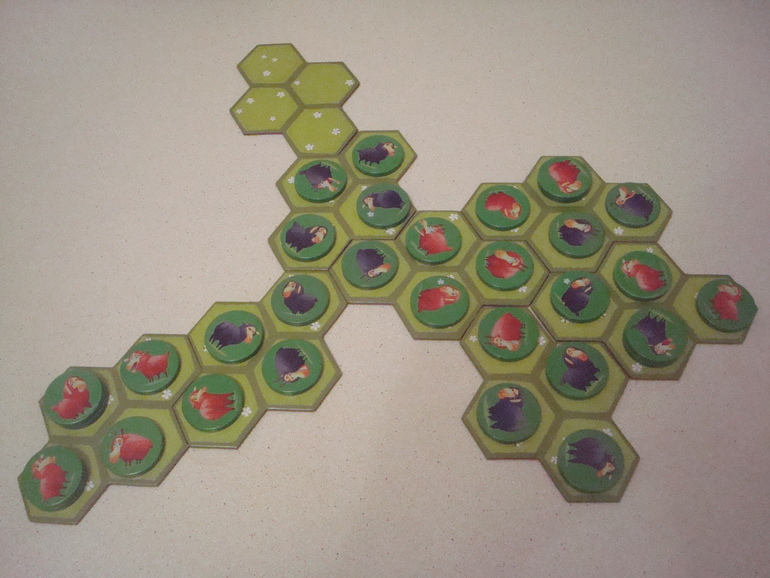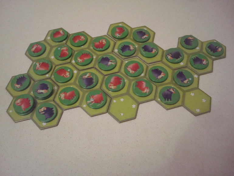 Для тех же, кому не хочется переходить по ссылке, в двух словах обмолвлюсь о правилах. Они на самом деле очень простые. Каждый игрок (а их может быть от 2 до 4) берёт себе 4 тайла пастбища, из которых составляется игровое поле (замечу, каждый раз разное) В нашем случае, так как играли вдвоём, поле всегда состояло из 8 тайлов. Затем игроки по очереди размещают на краях поля стопки своих овец (16 штук у каждого) и тут, собственно, и начинается борьба...