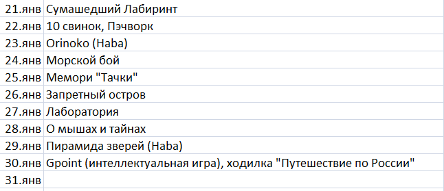 Писать не стала кто играл, но в выходные обычно всей семьей, а на неделе только мы вдвоем, так как папа уезжает в командировки. Итак, таблица!