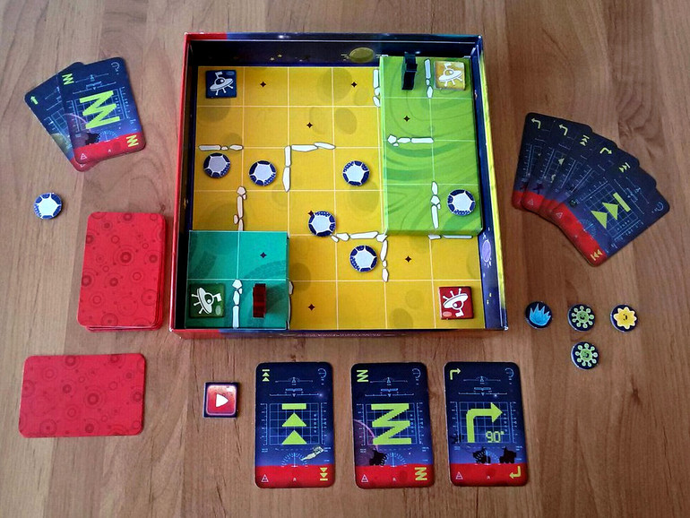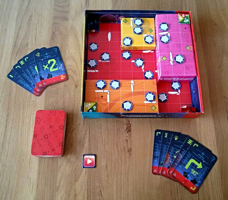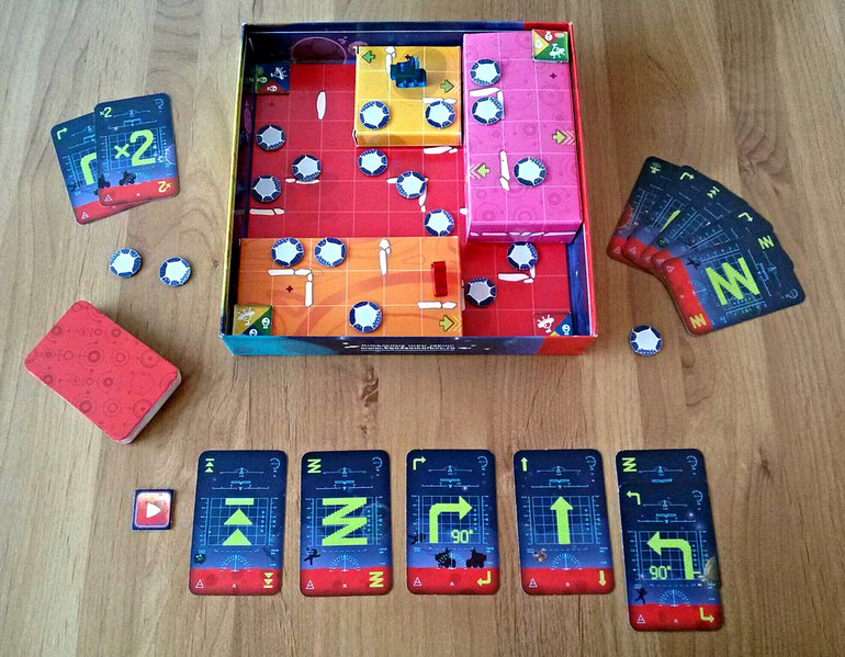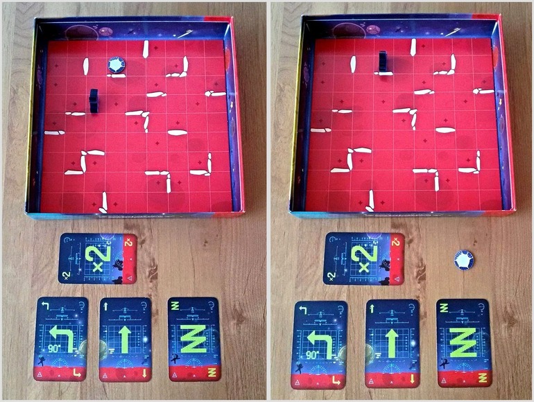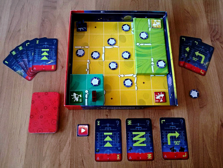 В свой ход игрок может выложить от одной до трех карт действий и в соответствии с выложенным алгоритмом вездеход будет перемещаться по игровому полю. В базовых правилах участвуют шесть видов карт.