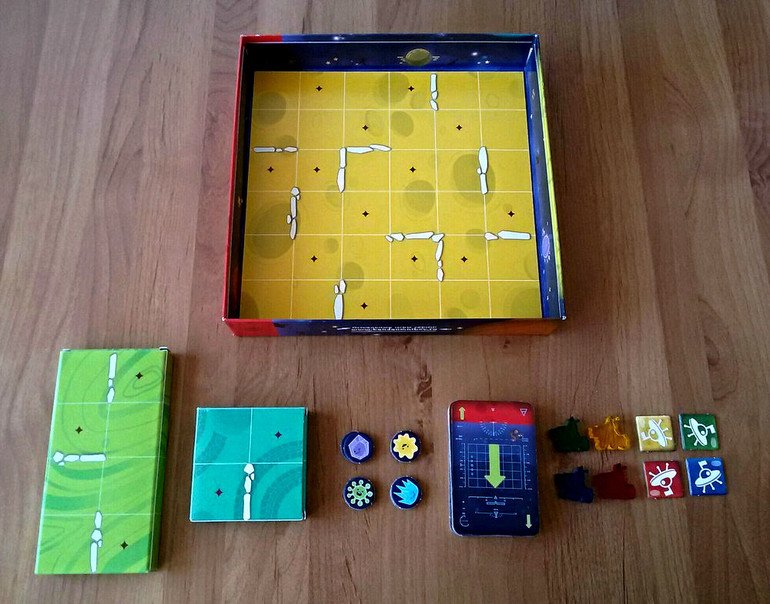 Вот так выглядит поле и компоненты для базового уровня. Два блока-холма расставляем на поле, отбираем девять образцов жизни (по три штуки каждого типа) и раскладываем их на квадраты со звездочками. По углам размещаем жетоны баз, помещаем на них вездеходы и раздаем участникам по пять карт.