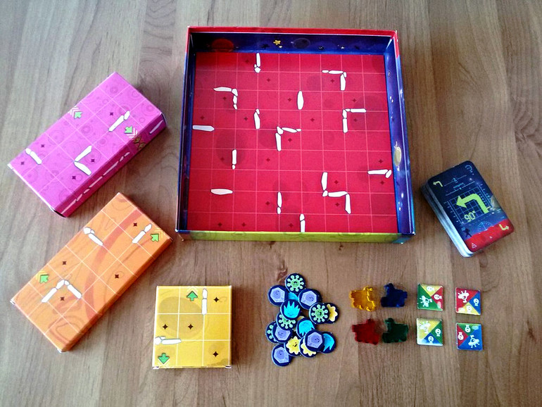 Допустим, движение начинает красный вездеход. Сначала он едет вперед до упора и забирает себе образец жизни. Жетон кладется перед игроком лицом вниз. Выяснить, какой тип образца на жетоне, можно будет только доставив его в лабораторию. Далее он запрыгивает на блок и разворачивается на 90 градусов направо.