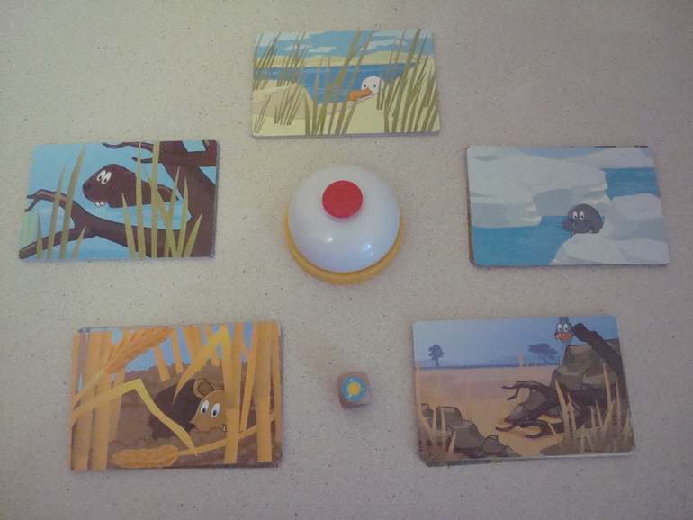 Перед началом игры разделяем карты животных на 5 примерно одинаковых стопок лицевой стороной вверх на равном расстоянии вокруг звонка.