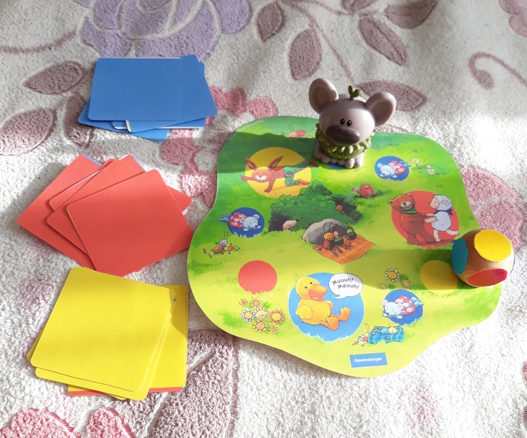 Кубик Катя сама ставила цветом, какого цвета карточку хотела взять) То есть ставила кубик желтой точкой вверх, ставила мышку на желтое поле с заданием и брала желтую карточку.