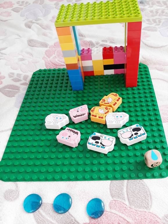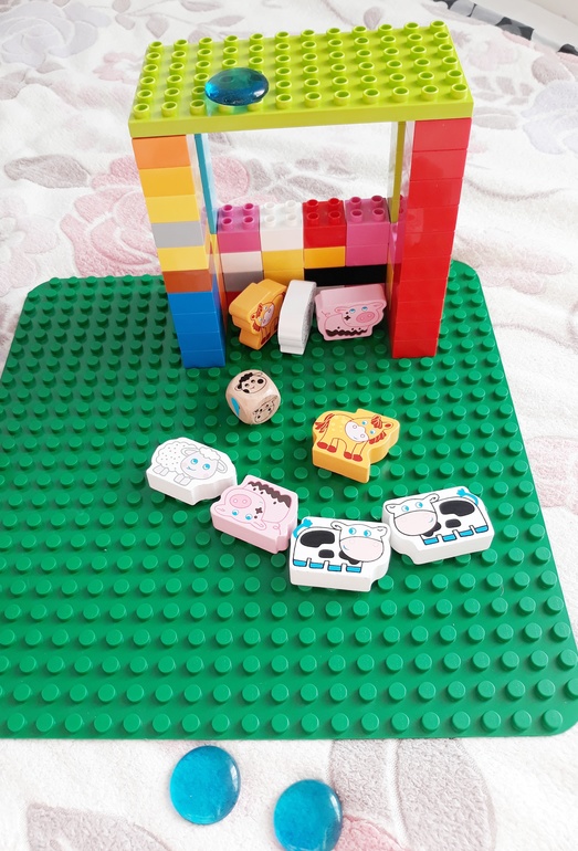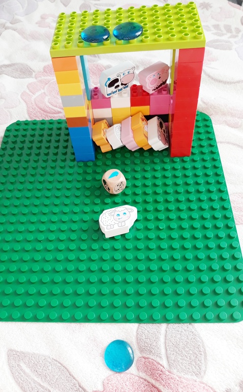 Кате игра очень понравилась, а мне понравилось, что Катя следовала кубику, то есть выполняла условия игры. Но сложно было объяснить, как быть, если, например, овечки уже в ангаре, и на кубике снова выпала овечка. Чтобы не путаться, мы брали овечку из ангара и бежали спасать друга)