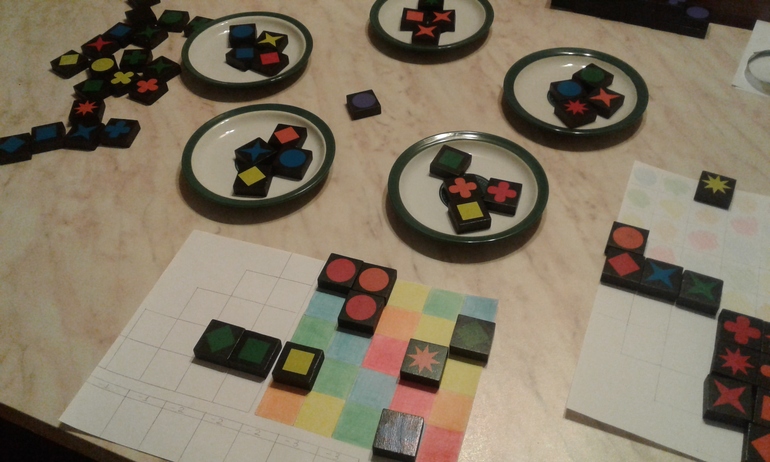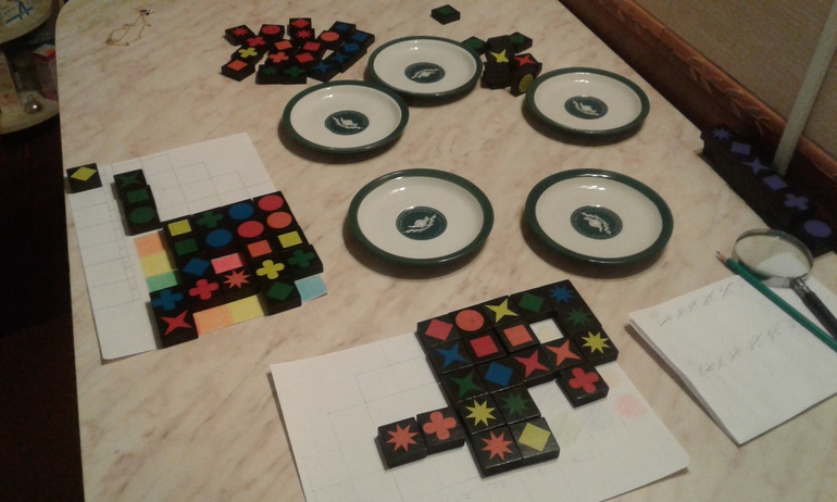 головоломки, логические игрыВсе же знают, что грядёт локализация безумно красивой абстрактной новинки Азул (Azul). Вот прямо уже со дня на день она должна появится в продаже. И, конечно же, я очень её ждала. А чтобы скрасить ожидание и заодно посмотреть, как работает механика, я смастерила её из подручных средств: фишки от Квиркл, блюдечки, пара листов А4, цветные карандаши, полчаса на рисование.