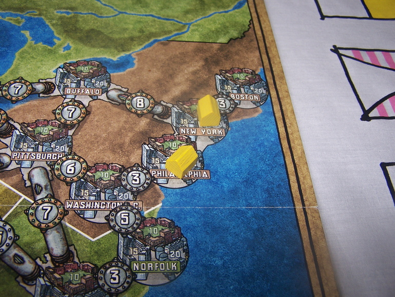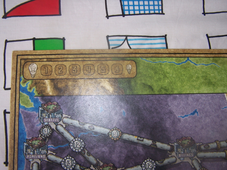 Далеее нужно обеспечить станции топливом. Рынок топлива находится внизу карты. Цена одной единицы топлива указана в правых верхних углах блоков. На деньги, оставшиеся после покупки станций, игроки покупают топливо, и начинает тут тот, кто оказался последним в шкале очередности (а это несомненная выгода, ведь топливо можно купить дешевле). На одной станции может храниться запас топлива не более, чем в двойном размере, чем требуется на одно отопление.