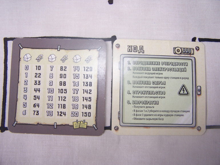 Подготовка к игре занимает достаточно много времени. Каждый игрок в начале игры получает 50 электро (электро - это валюта энергосети), набор домиков-фишек, и карту-памятку.