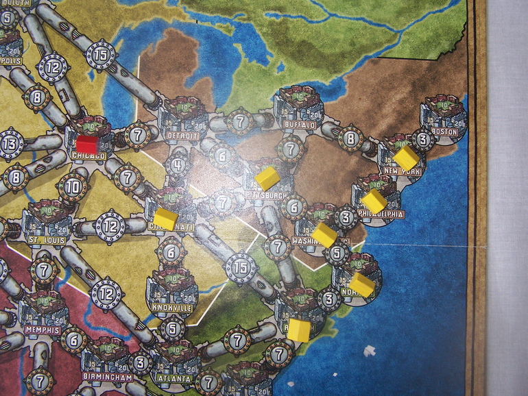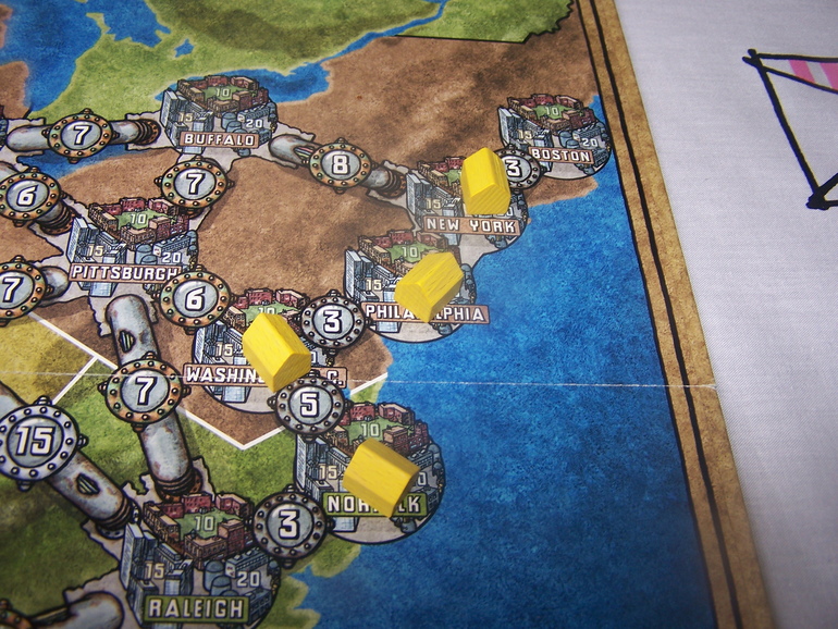 Здесь станции в сумме могут отопить 15 домов, этого достаточно для победы, например, в игре вшестером. А вот если для победы нужно построить и отопить 17 домов, то придется менять какую-то станцию на более производительную. Ну, и не забыть вовремя запастись топливом.