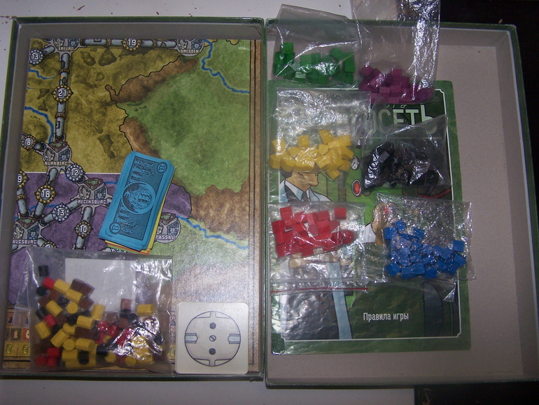 У нас старая базовая версия, с картой Америка/Германия. Коробка без органайзера, но нам он и не нужен. Внутри коробки - карта, Домики-фишки игроков на 6 человек, ресурсы, деньги, карты станций.