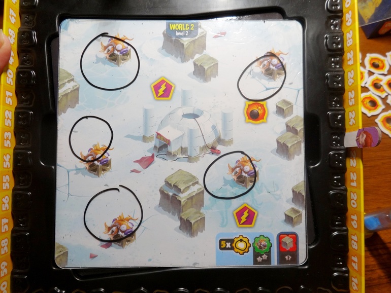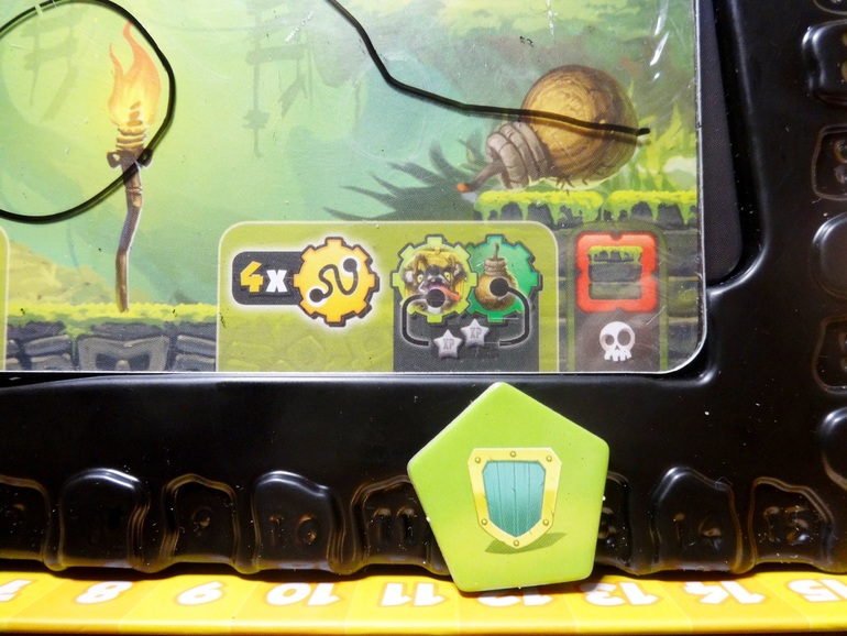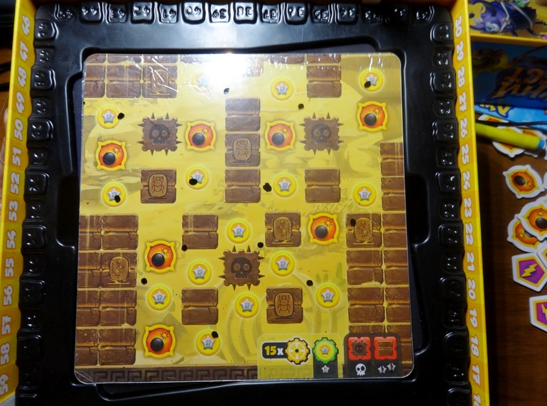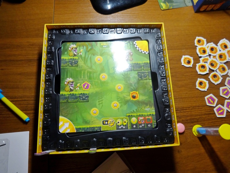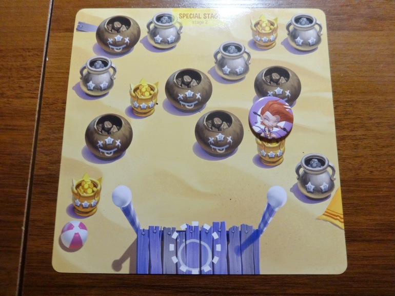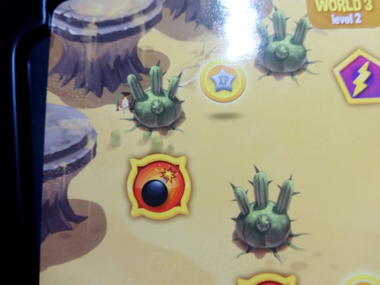 Если задеть ее линией, то можно попытаться заработать дополнительные очки. Дочка заработала штраф за кактус, но фею задела )). В этом случае мы достали карточку специального уровня, куда помещается жетон игрка (внизу, круглый), и игрок щелчком толкает его вперед.