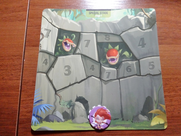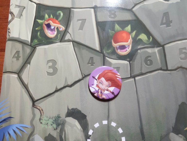 Если жетон вылетел за пределы поля или попал к плотоядному растению, то очки не даются, а если попал на цифры, то выбираешь наибольшую из тех, что касается жетон, и добавляешь себе столько очков на треке. Ниже видно, что Ксюша добавила себе 7 очков.