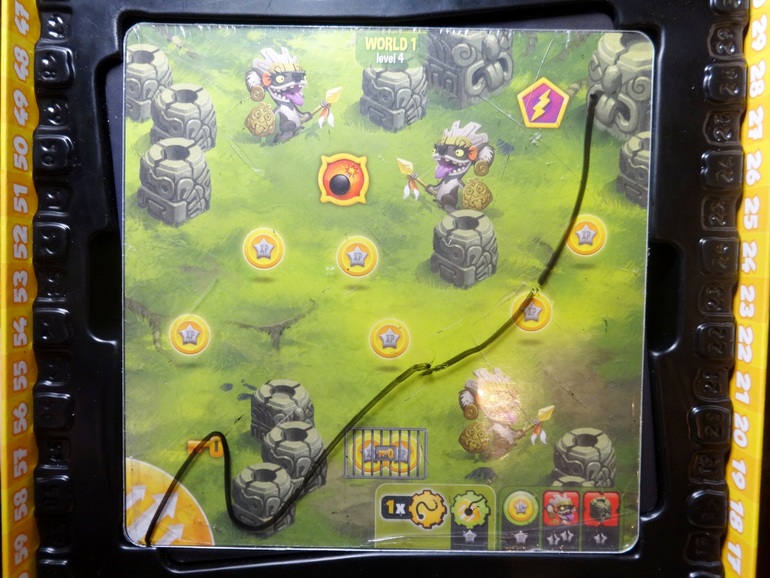 Порой бывает так, что все заработанные очки тут же вычитаются в качестве штафов за касание запрещенных элементов. На фото ниже дочка заработала за выполнение задания и звёзды 3 очка, но 3 же и вычитается за касание каменных идолов ((.