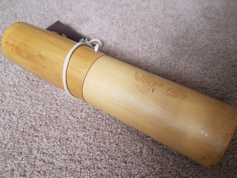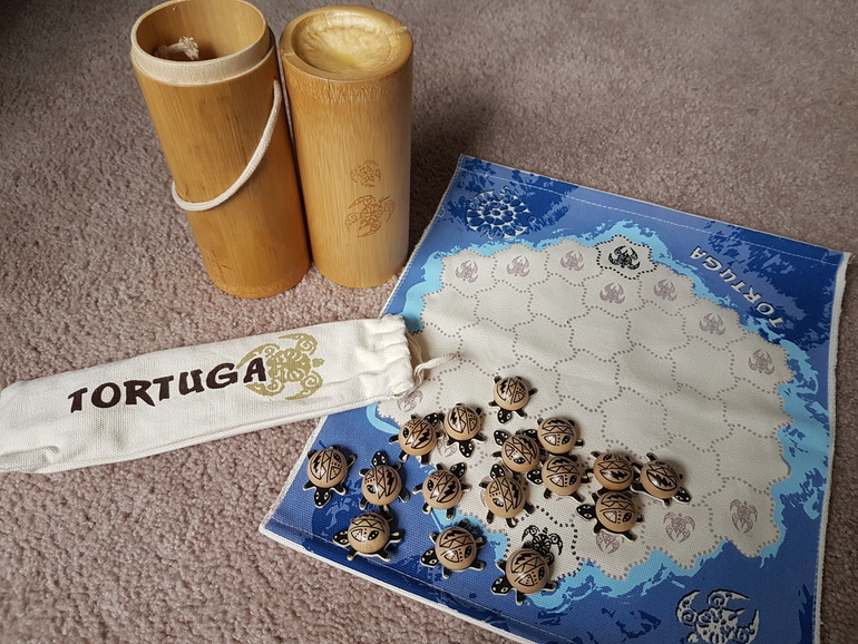 Хранятся все компоненты в бамбуковом тубусе: деревянные черепашки и тканевое игровое поле.