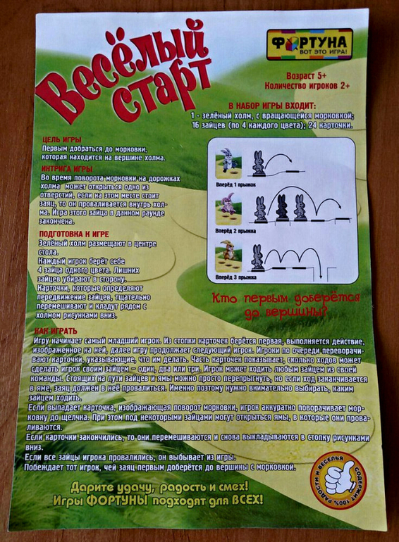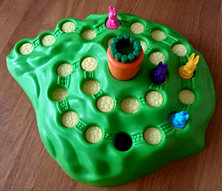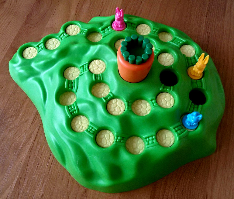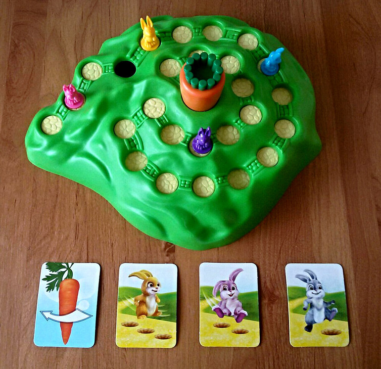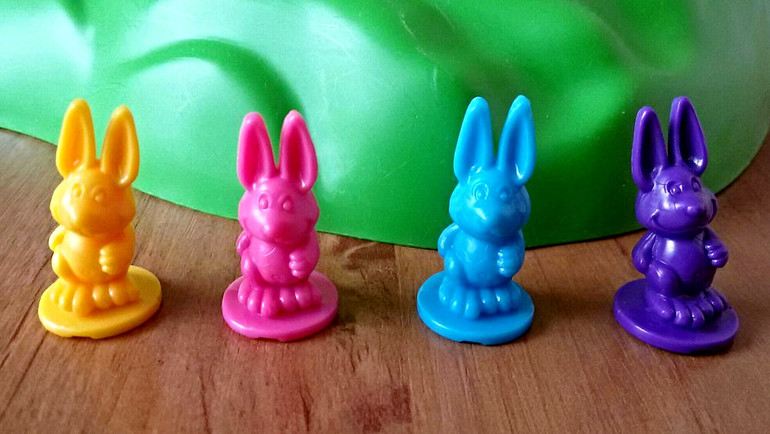 Кстати, на поле может быть несколько кроликов одного цвета. Если игрок видит, что походив выпавших два хода, его кролик упадет в дырку, он может ввести в игру новую фигурку. А если до отверстия два хода, а у игрока выпало три шага, значит кролик дыру перепрыгивает.