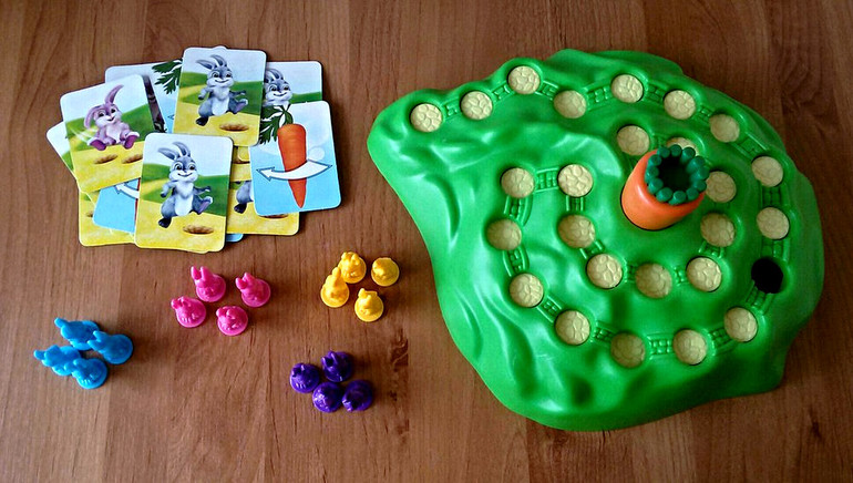Именно карты определяют ход игрока, который либо передвигает своего кролика на заданное количество шагов, либо крутит морковку.