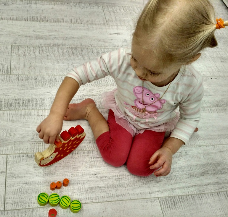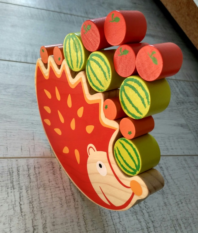 На Ежика надо нагрузить 3 вида фруктов разного размера, по 4 штуки каждого! Итого 12 фруктов!