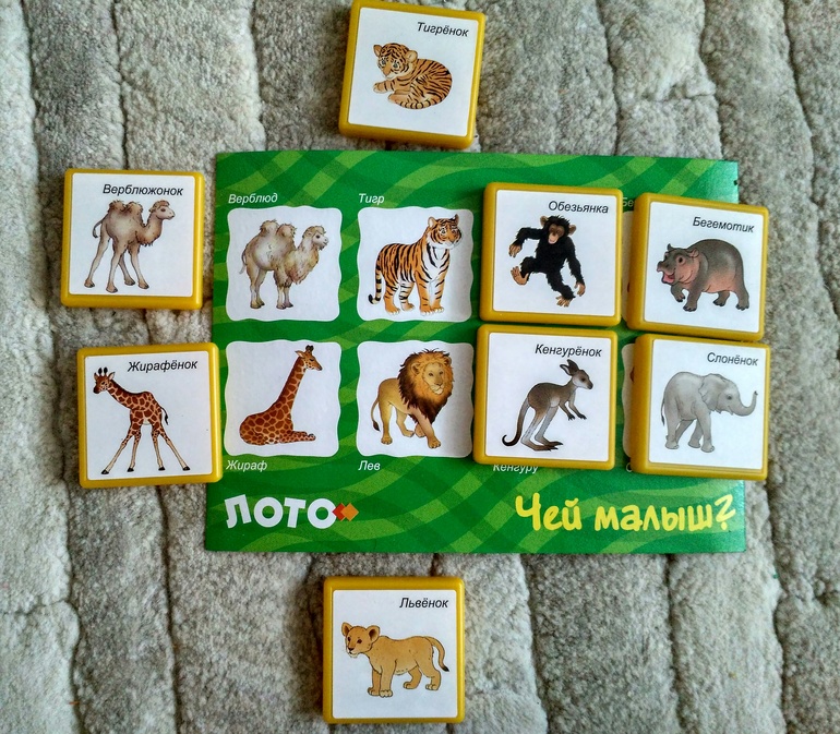 Даше лото нравится, с первой игры трудностей сопоставить маму и малыша не было у большинства животных. Иногда название помогает. Например лев и Львёнок не очень то внешне похожи но зато на слух сразу ясно кто есть кто.
