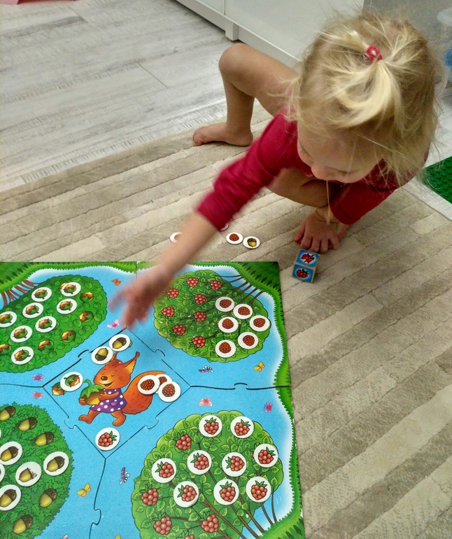 Достаём "Озорную белку", но чаще начинает и бросает. Партии все таки слишком длинные для дочки, хотя процесс бросания кубика и сразу результат - берёшь орех понятен и нравится! Ещё Даша с удовольствием делится с белкой, прям нравится ей этот ход!
