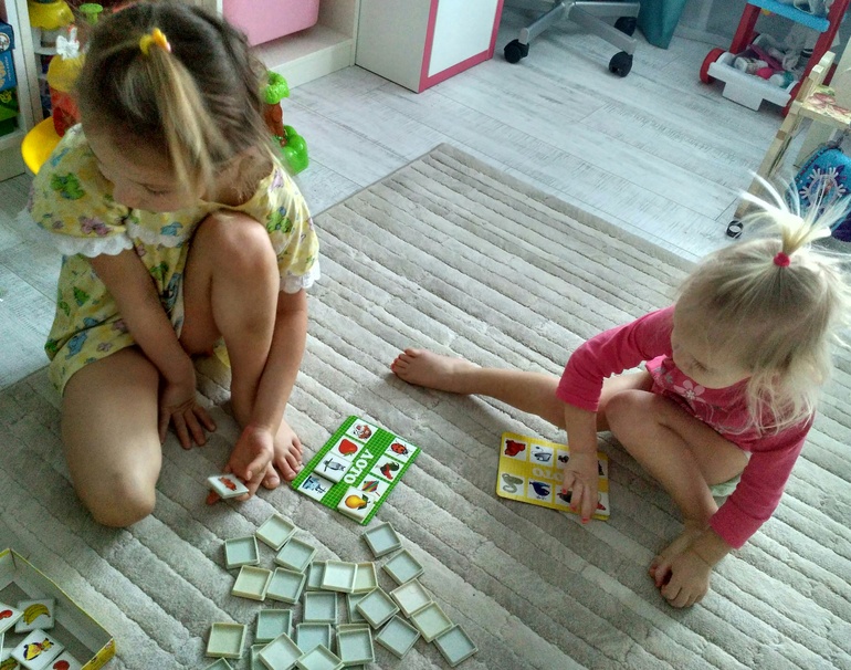 Первое время играли постоянно!! По 3-4 партии, и так несколько раз в день!! Хорошо, что Даша делает все сама, открывает фишки, смотрит у кого и отдаёт!! Наше дело просто присутствовать: