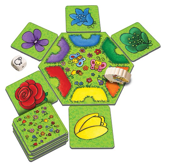 На стол кладется игровое поле - цветочный луг. Кучеряшка ставится на любое деление на лугу. Затем раскладываются жетоны цветов. Бросок кубика определяет на сколько делений овечка двигается по игровому полю. Побеждает тот, кто собрал больше всего цветов.