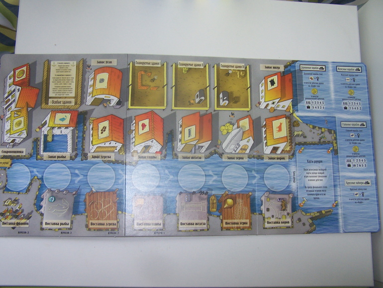 Конечно, по одной партии оценить игру в полной мере невозможно. Выиграл у нас Влад, который в правилах прочитал самую главную строчку: корабли очень важны. И начал скупать корабли с самого начала игры. Про корабли быстро понял и Андрей, а мы с Анатолием без кораблей под конец игры только и думали, чем же прокормить своих рабочих... Но в следующий раз будем умнее, а то, что следующий раз будет, я не сомневаюсь. Игра очень понравилась, оказалась даже лучше, чем я представляла (я думала, что все будет темное-мрачное, а оказались вполне приятные цвета). Да и тема порта гораздо ближе пацанам, чем выращивание овощей и разведение животных в Агриколе.