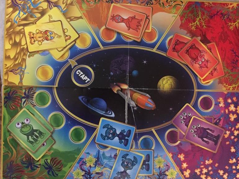 Это ходилка с условиями. В начале игры поровну раздаются карточки с инопланетяшками разных цветов (они живут на планетах соотв.