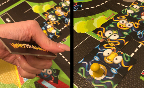 Игра "Веселые монстрики". Недорогая, плотный картон, но мне ужасно не нравятся эти монстрики, противные глаза, но сына естественно это не смущает и играет с удовольствием. По правилам нужно подобрать монстрика из своих карточек, чтобы он соприкасался с монстриком на поле хотя бы одной лапкой; цель скинуть все свои карточки.