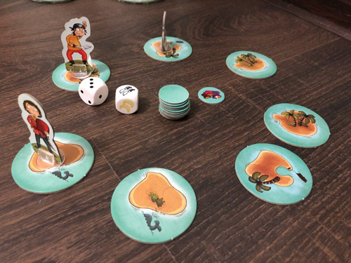 Недорогая, покупала со скидкой, не очень качественный картон, да и игра не особо интересная. Тайлы с островами раскладываются по кругу, в произвольном порядке ставим фигурке капитана и пирата с обезъясной, кидаем кубики: на кубике с точками - ходы капитана, двигаем по островам, на втором кубике выпадают ходы пирата или обезъяны, цель не попадаться пиратам и собирать сокровища. Поиграла с сыном раза три за месяц