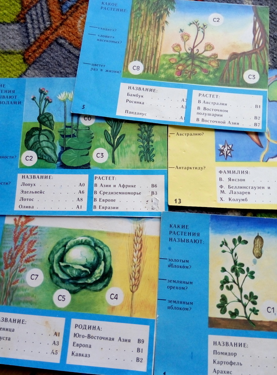 Тоже была любима не только мной. Карточку с заданием помещали на планшет. Напротив вопроса ставился какой-то штыречек (если я правильно помню) и выбирался ответ. Сохранилось несколько карточек. Может у кого-то есть?