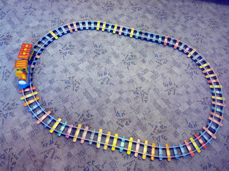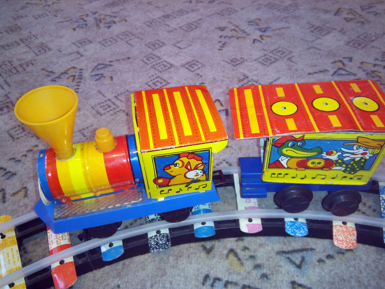 Паровоз едет от батарейки. Снизу у него есть молоточек, который при движении ударяет по шпалам. Если шпалы разложены в соответствии с инструкцией, получается мелодия детской песенки.