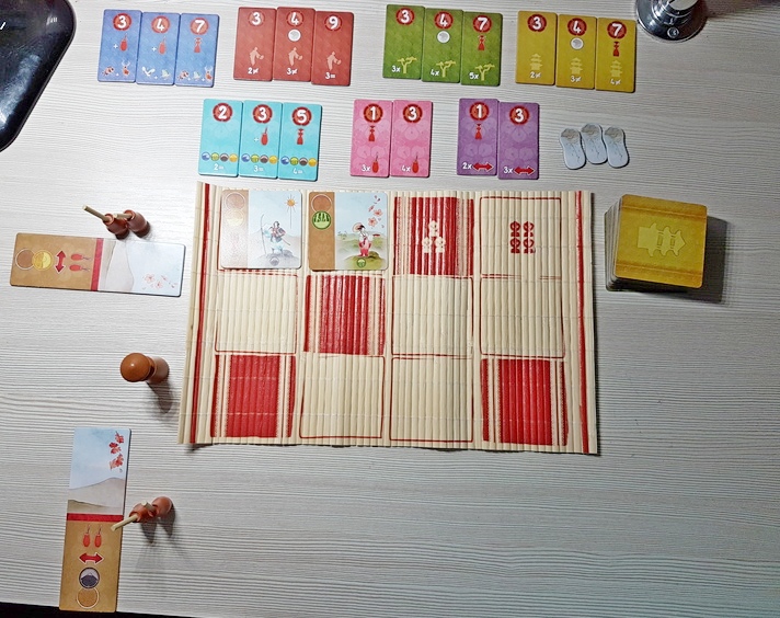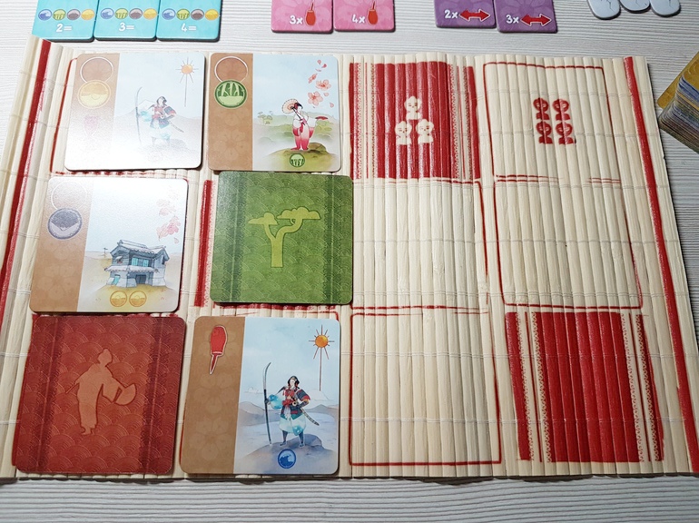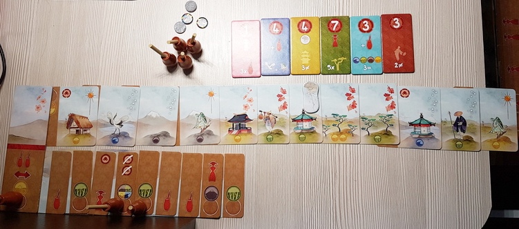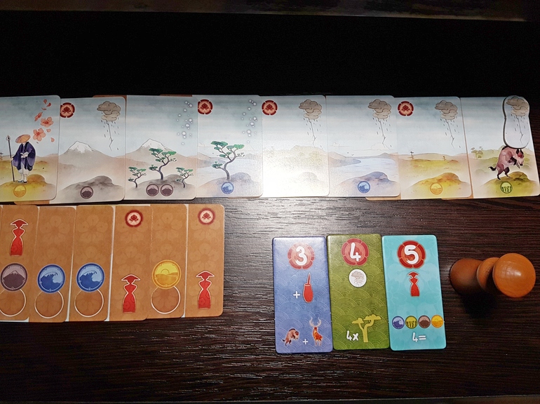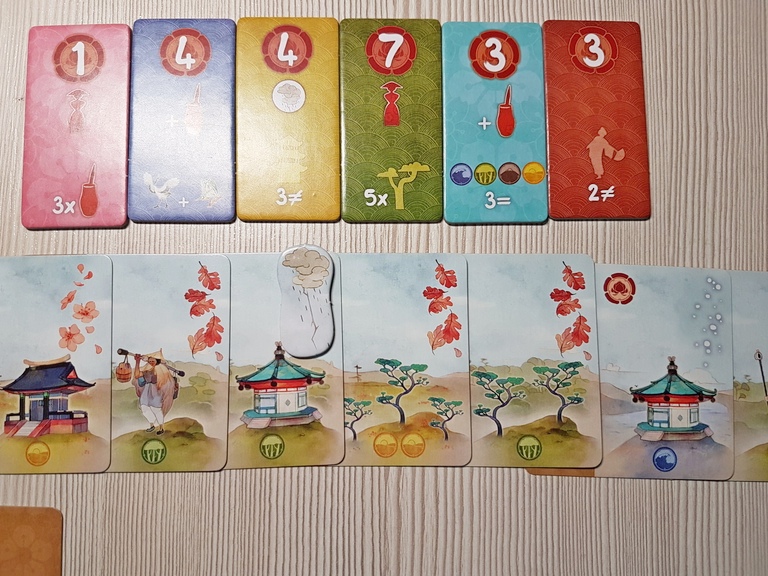 Кроме того, фигурка мастера в конце игры осталась у дочки, а это значит, что ее полотно мастеру понравилось больше и он дал ей свое благословение на дальнейшее творчество (что принесло ей еще 2 очка). Сложив вместе все показатели, мы получили... ничью! Очень неожиданно наши совершенно разные стратегии дали нам одинаковое количество баллов. Никто не был разочарован, потому что Канагава - это такая игра, в которой получаешь огромное удовольствие от процесса - выбора карт, добавления их в свои ряды, создания самого красивого пейзажа, получения за это наград, - что забываешь о соперниках.