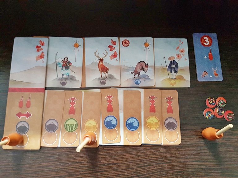 Итак, мы будем создавать свой неповторимый пейзаж, постепенно приобретая навыки изображения разных типов местности - мы будем рисовать лес, животных и даже дома и портреты людей. Для каждого рисунка требуется своя краска. Нам, новичкам, мастер доверил только по одной краске и всего по две кисти. Для нас приготовлены грамоты, которые отметят ступени нашего мастерства и дадут нам дополнительные преимущества (а в конце игры принесут победные очки). У каждого игрока может быть только по одной грамоте каждого цвета, таким образом на протяжении всей игры приходится принимать решение - получить грамоту с меньшим номиналом или добавить в свою мастерскую или полотно еще карты, чтобы претендовать на большее количество очков (тут есть риск, что нужные карты так и не придут или нужную грамоту соперник заберет раньше, а предыдущую взять будет уже нельзя).