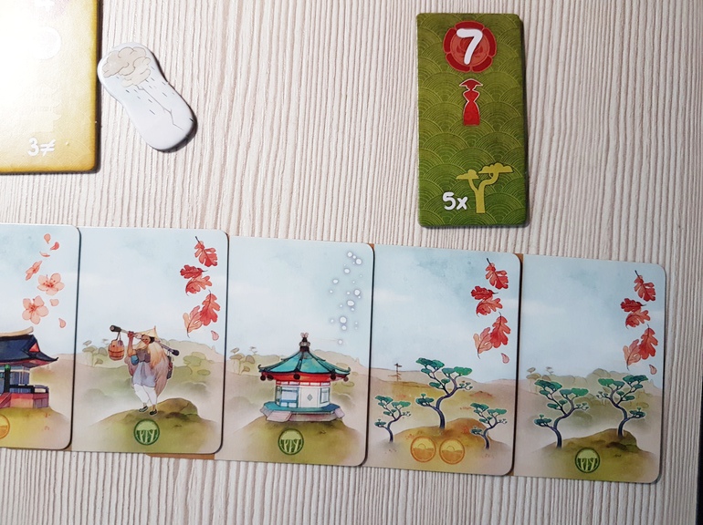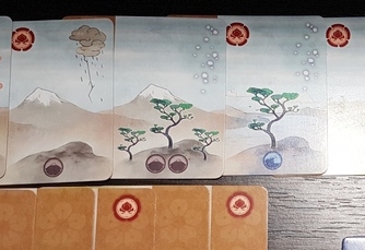 А еще оказалось, что дочка создала довольно большой пейзаж в одном времени года. На фото ниже последние 7 карт картины у дочки царила зима (карты обозначены снегом или тучкой - тучка это универсальное время года, игроки по своему желанию его определяют. В данном случае дочка решила, что это зима - таким образом у нее получился непрерывный "зимний" ряд).