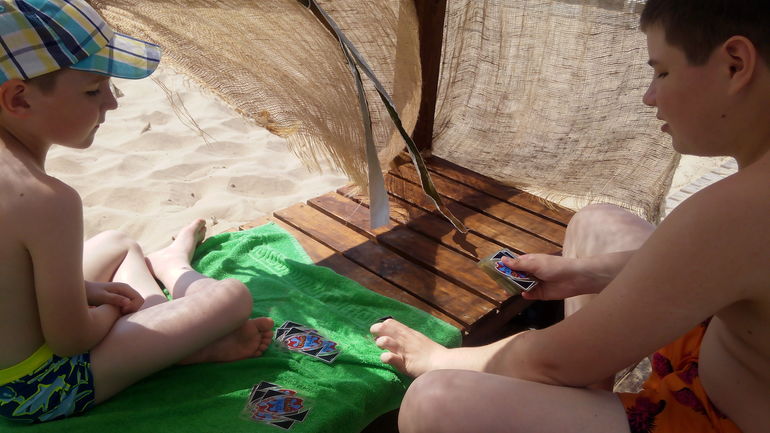 Играли везде - в столовой, аэропорту, на пляже... Самыми востребованными в компании 7, 13, 38 лет оказались Уно, Лось в доме, Танки, Шоколадная колдунья, Аллес тролли, Спящие королевы. Кстати, нигде не встретили играющих в игры(((( зато сами привлекали внимание детей, которые просили взять их в игру.