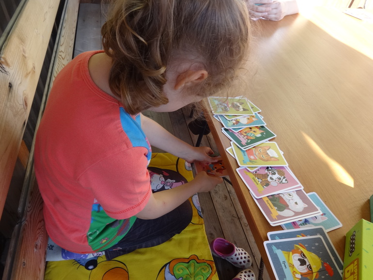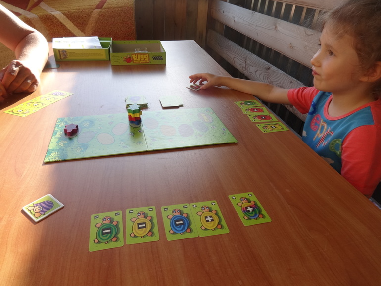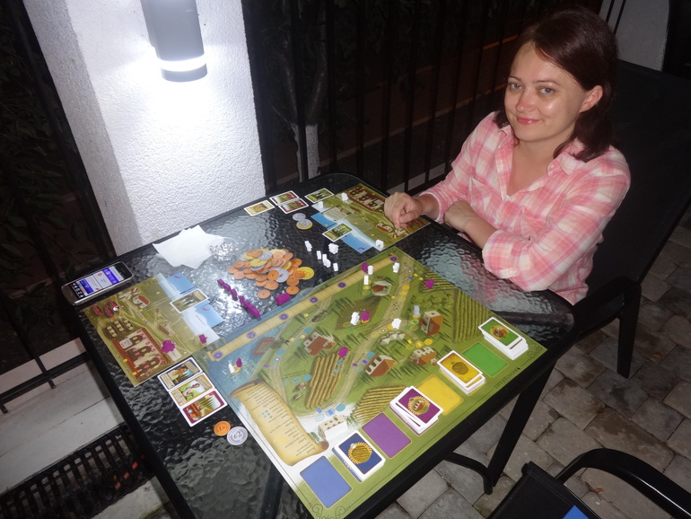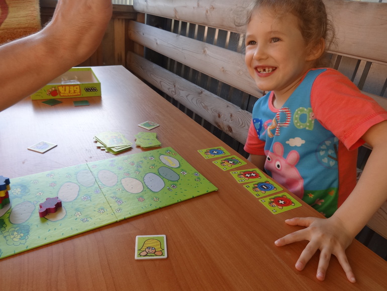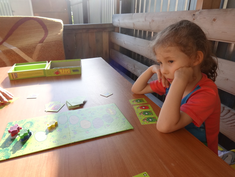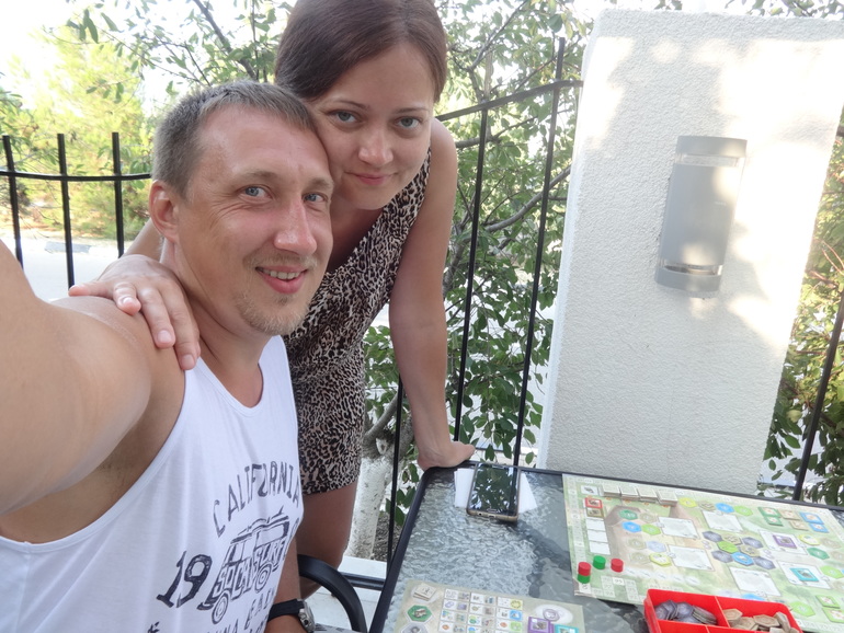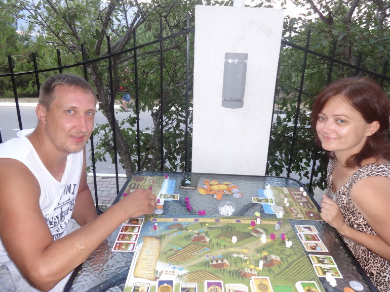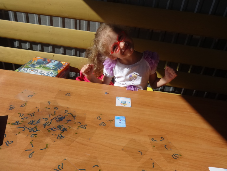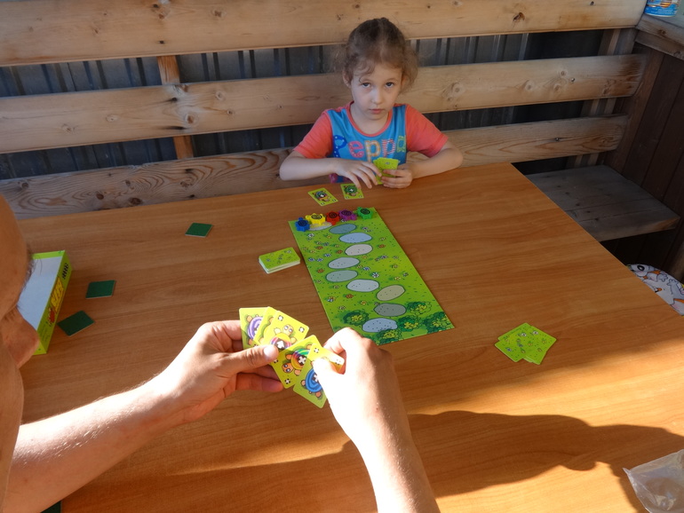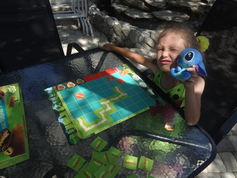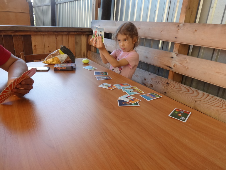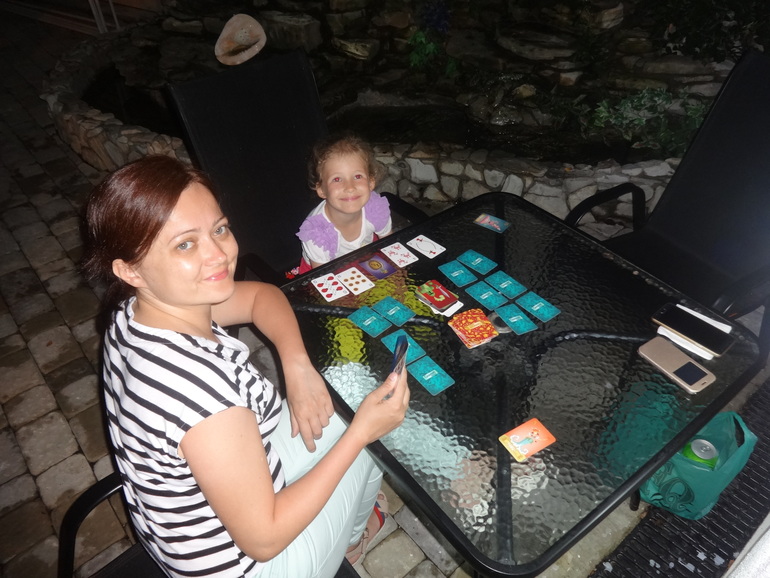 А по вечерам на террасе отеля мы, конечно же, играли. Янка даже с ребенком поиграла. Это был ее первый опыт игры со сверстником. Правда не очень удачный,т.к. пацан проигрывать не мог вообще, и закатывал истерики с выхватыванием карт из рук, сбрасыванием элементов игры со стола и попытками мухлежа. Так что после нескольких партий, Янка играть с ним в настолки отказалась):