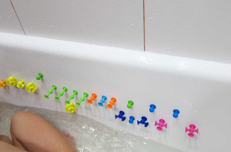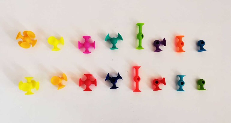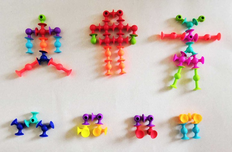 В наборе 45 присосок разных цветов и конфигураций. Детали одной конфигурации одного цвета. В разных наборах разные цвета деталей. Цвета деталей ярко-насыщенные. Детальки качественные, запаха не имеют.
