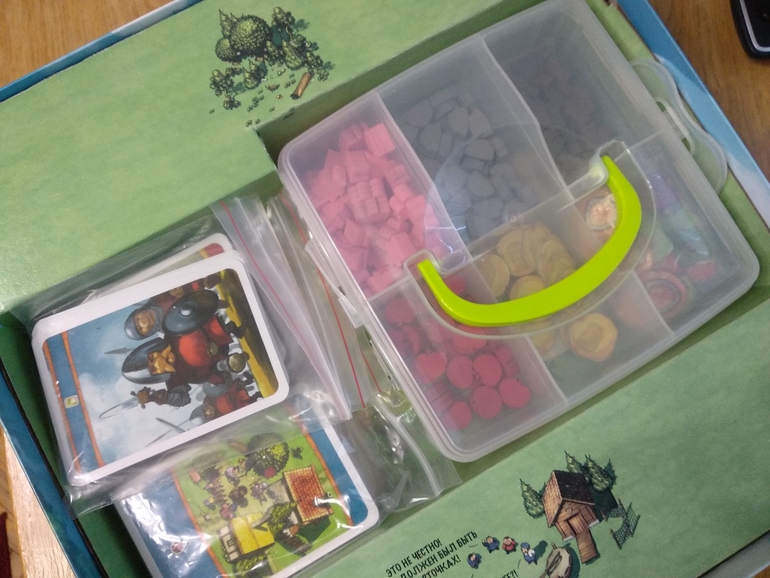 В игре «Поселенцы» многочисленные компоненты сложили в контейнер (из Фикс Прайса), оказавшийся под рукой, который вместили в коробку, чуть его подрезав.