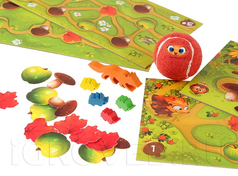 Соревнуйтесь с друзьями в ежиной перекати-гонке: бросайте мохнатый мячик на жетоны-липучки и собирайте яблочки, листочки и грибочки, чтобы продвинуться по лесной тропинке к домику ежа.
