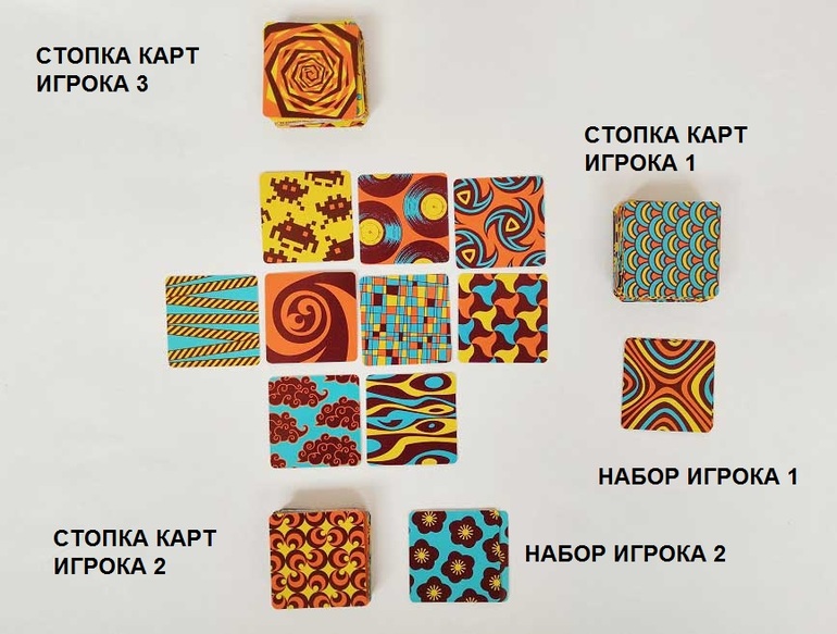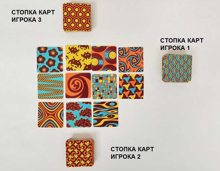 Игроки открывают свою карты, переворачивая их от себя. Но т.к. карты двусторонние (рубашек у них нет), то в игре участвуют не только карты, выложенные на стол, но и стопки карт игроков, а также наборы, которые он наберет (помните, что карты есть в 3 экземплярах? это именно тот случай!)