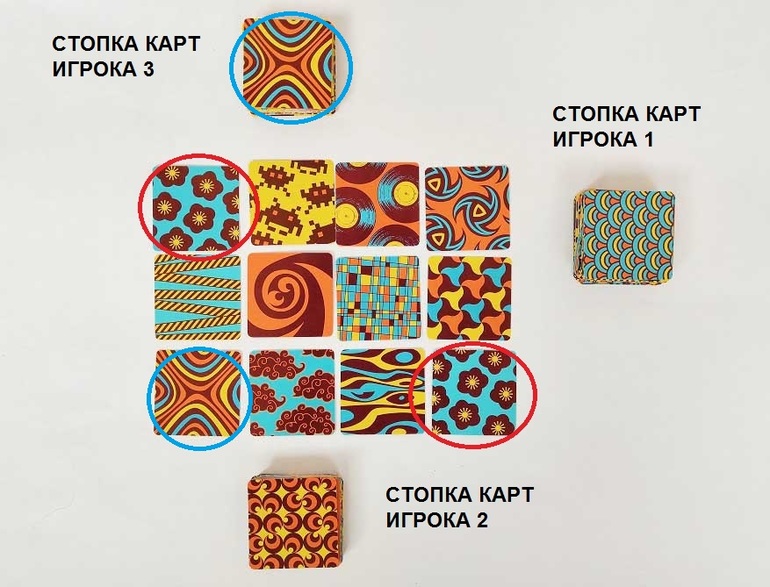 Не дремал и первый игрок, он обнаружил, что теперь верхняя карта на стопке третьего игрока, которая открылась при его ходе, совпадает с картой на столе и молниеносно накрыл эти карты своими ладошками (голубые кружки)