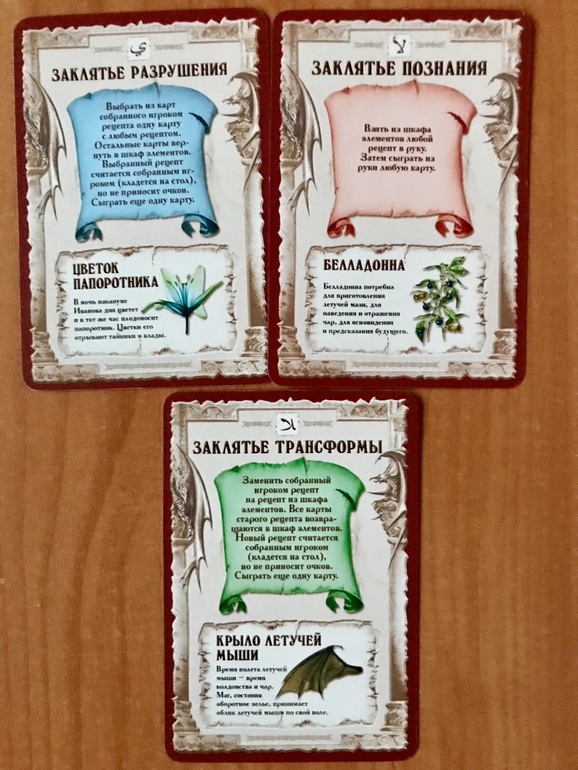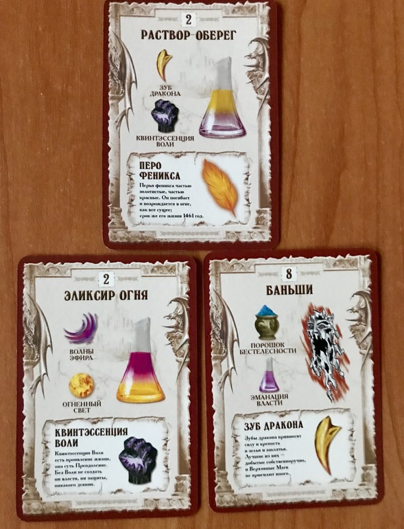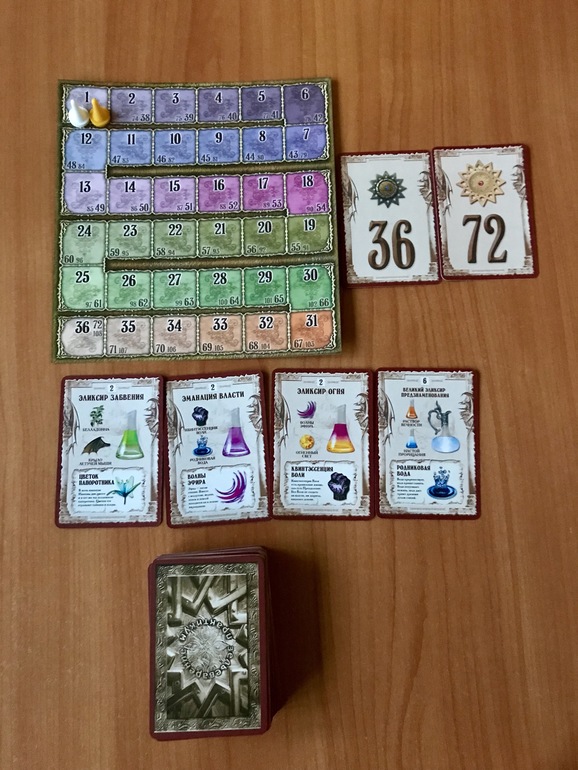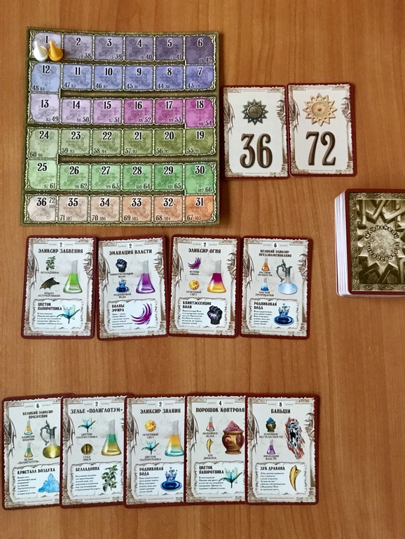 Итак, перед нами поле для подсчета очков, фишки игроков, карты-маркеры очков (когда фишка проходит все поле и игрок набирает 36 баллов, фишка переходит в начало поля, а игрок получает маркер, когда набираем еще 36, маркер переворачивается другой стороной на 72 балла), шкаф со снадобьями, в котором в начале игры лежит 4 карты (в шкафу игроки смотрят только нижнюю часть карты-на элемент зелья) и колода карт. Игроки получают по 4 карты в начале игры.