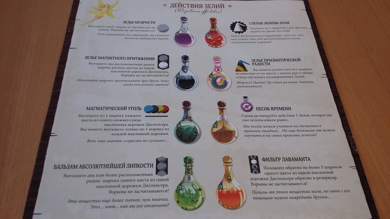 Зелья можно выпивать во время игры, они помогают вытаскивавать в свой ход из диспансера еще больше ингридиентов для ваших зелей.