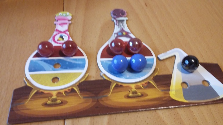 По завершению хода он проверяет готовность зелий, откладывает их рядышком как приготовленные переворачивая другой стороной, шарики из зелья возвращает в диспансер тоже случайно и игрок на место приготовленных зелий берет из стопочек следующие.