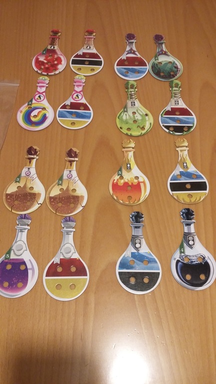 Потом из оставшихся колб выбираются каждым игроком колбы отмеченные звездочкой случайным образом (это зелья для новичков) и распологают их в середине стола рецептом вверх. Потом начиная с первого игрока двигаясь по часовой стрелке игроки заполняют колбами свои подставки.