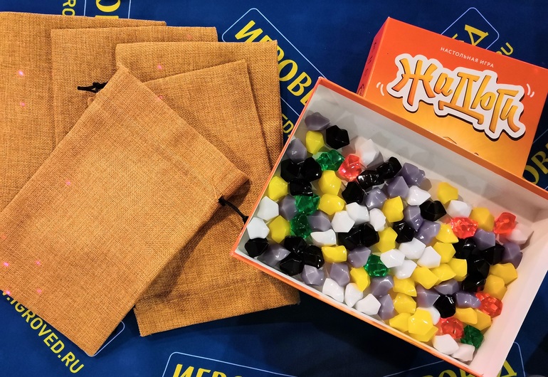 Вторым и главным открытием игротеки стала игра «Жадюги». Когда Аяна обратила мое внимание на новинку полтора месяца назад, я только отмахнулась. Не нашего поля игра просто камушки из мешочка вытаскивать и надеяться на удачу. Аяне же посоветовала присмотреть камушки в Фикс-прайсе, а мешочки попытаться сшить самой или поскрести дома по сусекам, обязательно что-то подходящее найдется. Когда на игротеке наши дети навострили лыжи на турнир по «Вампирчикам», мы с подругой решили не отставать. Одновременно проходил турнир по «Жадюгам». Желающих оказалось более 20 человек! Впервые такое видела. И наверное, не только я, потому что консультанты Игроведа тоже немного ошалели от количества поднятых рук на вопрос: «Кто пришел на турнир по Жадюгам?». А т.к. игра рассчитана на 5 человек, то срочно пришлось организовывать несколько столов.